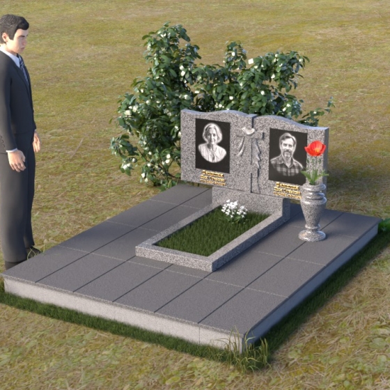 Данная мемориальная композиция представляет собой две стелы, выполненные из полированного гранита глубокого черного цвета, соединенные между собой. Каждая стела имеет мягкую, волнообразную форму верхней части, словно склоненную в тихой скорби. Боковые грани плавно скруглены, что придает изделию мягкость и элегантность. На лицевой поверхности стел выгравированы портреты, имена и даты, выполненные с высокой детализацией. Разделяет стелы искусно вырезанный крест, лаконичный и строгий, устремленный ввысь. Его грани контрастируют с полированной поверхностью, создавая игру света и тени, придающую рельефу дополнительный объем. Под стелами располагается горизонтальная плита, также выполненная из черного гранита, с зеркальной полировкой, отражающей небо и окружающий мир, символизируя вечность и непрерывность жизни. Дополняет композицию изящная ваза из гранита, предназначенная для живых цветов, которые станут символом любви и памяти.
