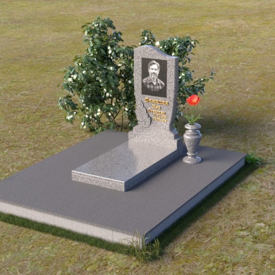 Величественная стела памятника ПВ 015 выполнена в строгой, но элегантной форме. Верхняя часть памятника имеет плавный, волнообразный силуэт, что придает ему мягкость и изящество. Сглаженные углы и отсутствие острых граней создают ощущение покоя и умиротворения. Боковые грани стелы слегка скошены, что визуально облегчает конструкцию и добавляет ей динамичности. Фаска, обрамляющая верхнюю часть памятника, подчеркивает его контур и придает завершенность образу. Нижняя часть стелы, переходящая в тумбу, имеет строгую прямоугольную форму, обеспечивая устойчивость и надежность всей конструкции. Зеркальная полировка поверхности камня отражает окружающий мир, создавая ощущение глубины и света. На стеле располагается портрет усопшего, выполненный с высокой точностью и детализацией, а также памятная надпись, нанесенная золотыми буквами.