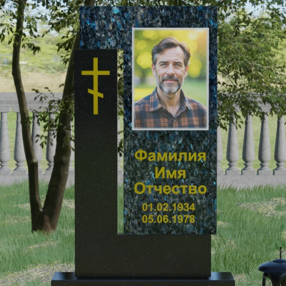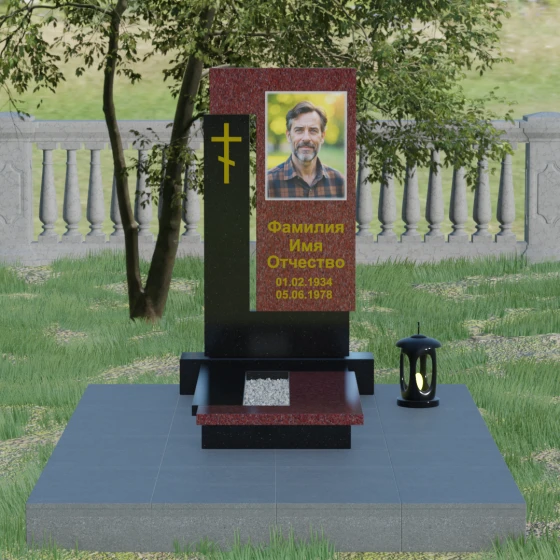 На боковом пилоне расположен каноничный православный крест. Его исполнение отличается благородной простотой — это лаконичный трехсоставный символ веры, который не перегружает композицию, но расставляет необходимые духовные акценты. Благоустройство участка продумано до мелочей: стела установлена на широкий полированный цоколь, а место захоронения полностью закрыто сплошной надгробной плитой. Такое решение не только придает ансамблю вид законченного монолита, но и обеспечивает практичность, избавляя от необходимости сложного ухода за почвой.