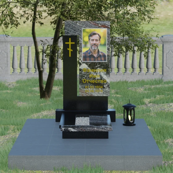 Данная модель выделяется своей сложной, архитектурно выверенной асимметрией. Основная вертикальная стела, выполненная из глубокого черного камня, дополнена массивным Г-образным элементом, который словно обнимает центральную часть, создавая защитный контур. Геометрия изделия строгая и лаконичная: прямые углы и четкие фаски подчеркивают монументальность конструкции. Особое внимание уделено игре фактур: идеально гладкая, зеркальная полировка лицевых граней контрастирует с архитектурной сложностью сочленения двух блоков.