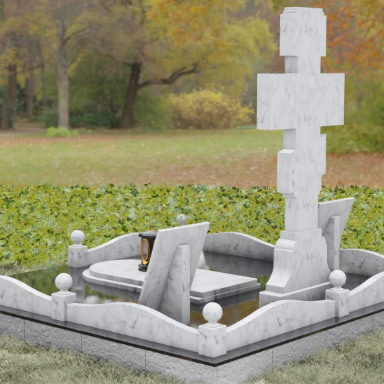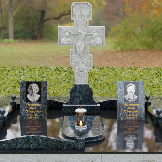 Данный мемориальный ансамбль представляет собой совершенный баланс между духовными традициями и современной архитектурной эстетикой. В центре композиции находится величественная стела в форме высокого православного креста, украшенного детальной многоуровневой резьбой. Барельефное изображение Распятия, выполненное с глубокой проработкой каждой детали — от складок плащаницы до ликов предстоящих, — создает ощущение покоя и благодати. Светлая, матовая фактура резного камня эффектно контрастирует с зеркально отполированными боковыми элементами, предназначенными для увековечивания памяти близких.