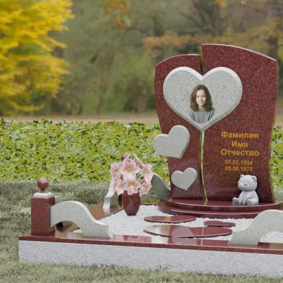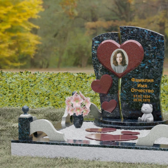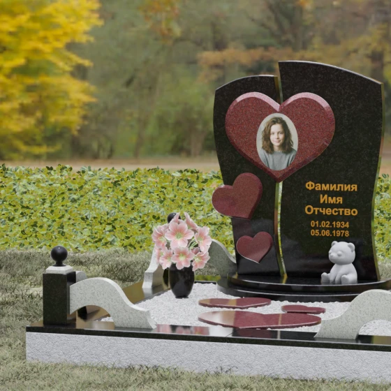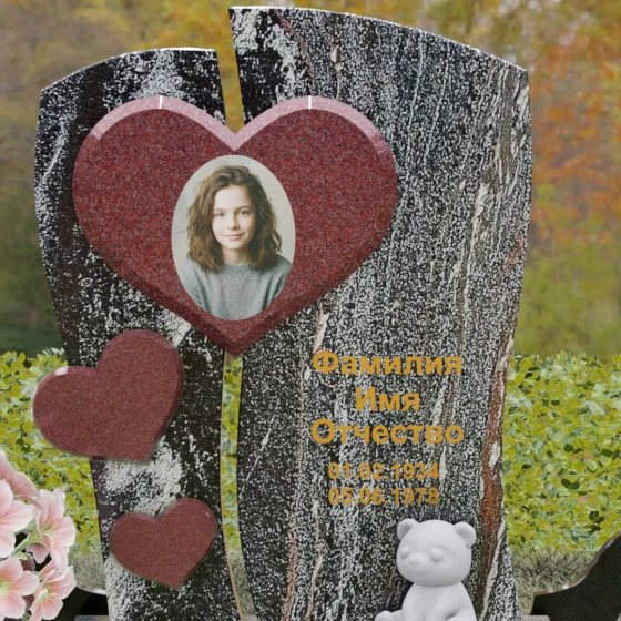 Оформление: Уникальная геометрия этого надгробия сама подсказывает идеальное расположение гравировки. Крупное центральное сердце словно создано для размещения портрета — здесь он будет главным смысловым акцентом, защищенным символом любви. Правую, более широкую часть плиты, рекомендуется использовать для нанесения Фамилии, Имени, Отчества и дат жизни. Здесь же останется достаточно места для проникновенной эпитафии или дополнительного декоративного элемента, например, небольшой виньетки или креста.