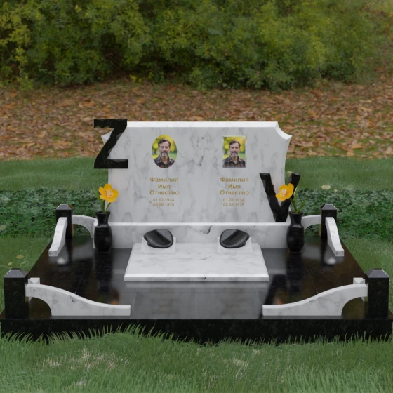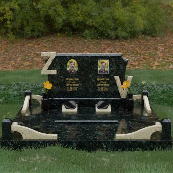 Центральным элементом изделия является массивная горизонтальная стела, обладающая сложной многоуровневой геометрией. Верхняя грань плиты украшена изящными симметричными вырезами, которые смягчают строгость прямоугольных форм и придают конструкции завершенный, эстетически выверенный вид. Особое внимание привлекает игра контрастов: глубокая зеркальная полировка основного массива камня эффектно подчеркивается светлыми вставками. Рельефные буквы Z и V, выполненные из контрастного гранита, выступают над поверхностью, создавая впечатляющий эффект объема и наделяя монумент уникальным характером.