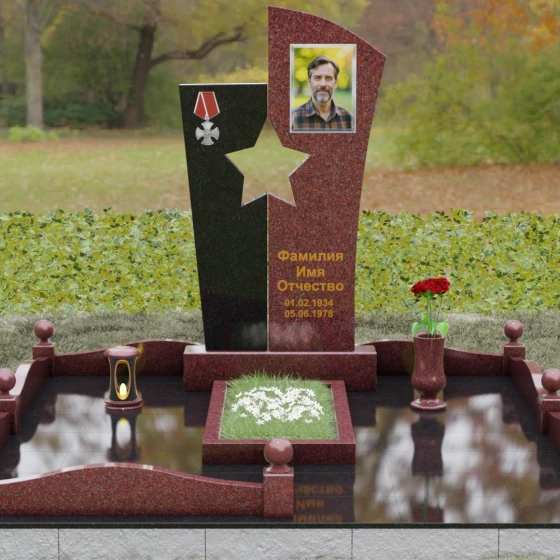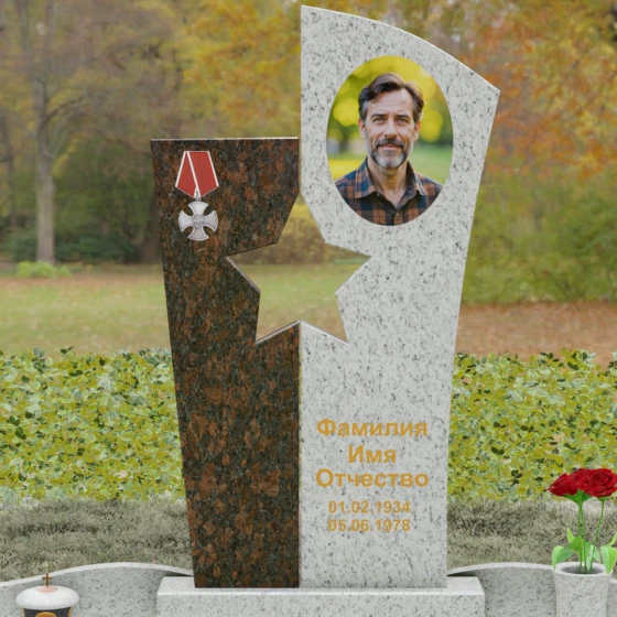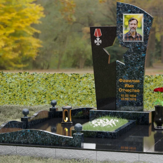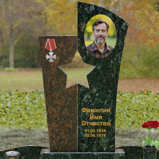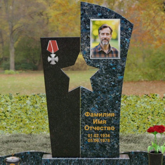 Оформление: Для данной модели рекомендуется использование высокохудожественной лазерной или ручной гравировки портрета на темном полотне камня. Золочение букв эпитафии идеально дополнит образ звезды и ордена, создавая торжественный и статусный вид. Широкое поле правого блока позволяет разместить не только даты жизни, но и важные слова, которые останутся в камне навсегда.