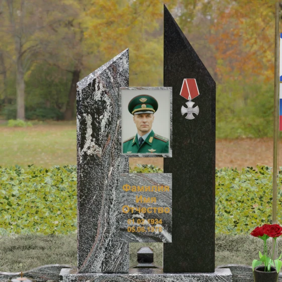 Центральным элементом ансамбля выступает сложная двухсоставная стела, представляющая собой две вертикальные плиты разной высоты. Их вершины оформлены в виде острых диагональных срезов, которые устремлены ввысь, создавая динамичный и одновременно устойчивый силуэт, напоминающий склоненные знамена или вершины гор. Грани камня подвергнуты многоступенчатой зеркальной полировке, что обеспечивает безупречную игру света на поверхности. В центральной части расположена прямоугольная ниша с портретом, а справа — объемный металлический барельеф в виде ордена Мужества, выполненный с высокой степенью детализации. Золоченая гравировка шрифта с глубокой выборкой идеально контрастирует с темным фоном, придавая надписям объем и обеспечивая их читаемость на многие десятилетия.