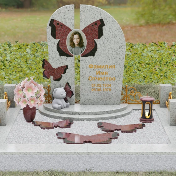 Форма и декоративное наполнение этого мемориального ансамбля пронизаны глубоким философским смыслом. Бабочка — древнейший символ человеческой души, проходящей через земную трансформацию и обретающей легкость в ином мире. Ее присутствие на стеле и в виде отдельных резных элементов, расположенных на поверхности цветника, говорит о хрупкости жизни и надежде на вечное возрождение. Плавные линии изгибов олицетворяют гармоничное течение времени и бесконечность памяти. Маленькая фигура белоснежного медвежонка у подножия стелы вносит ноту трогательной нежности, напоминая о чистоте чувств, искренности и той глубокой привязанности, которая не исчезает с уходом близкого.