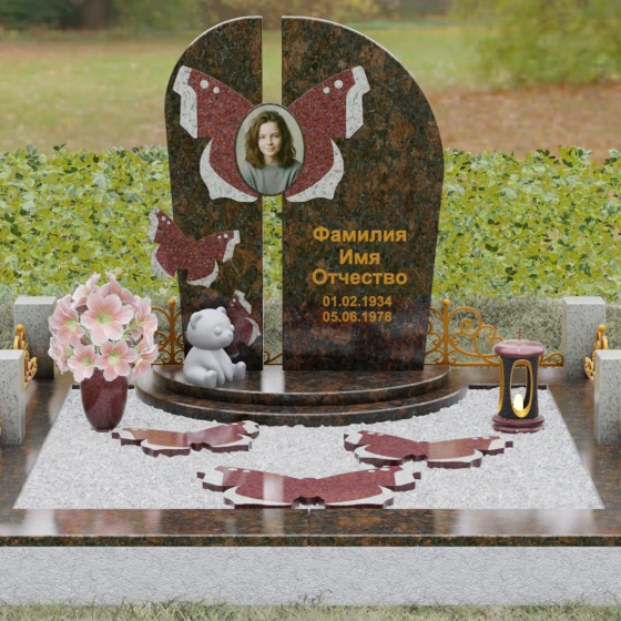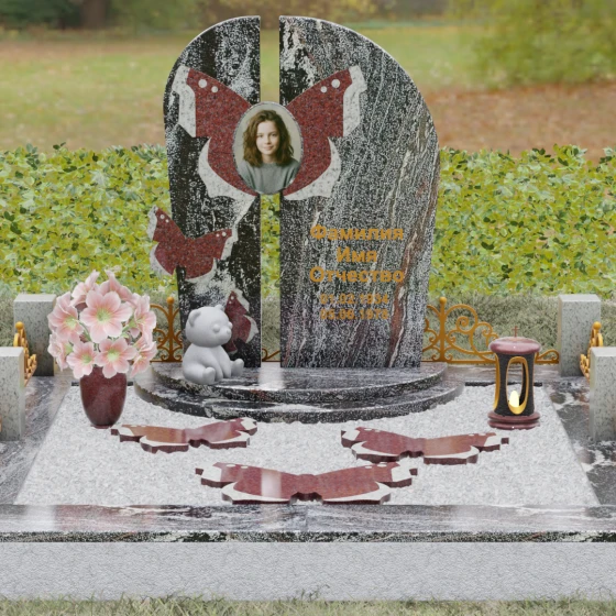 Центральным элементом ансамбля выступает величественная вертикальная стела, разделенная узким вертикальным просветом на две симметричные части. Этот архитектурный прием создает эффект воздушности и позволяет свету проникать сквозь плотную массу камня, символизируя открытость небесных врат и свободу духа. Верхушка стелы оформлена плавным полукруглым изгибом, лишенным острых углов, что дарит ощущение абсолютного умиротворения и вечного покоя. Главным художественным акцентом является мастерски выполненная инкрустация в виде расправленных крыльев бабочки, которые бережно обрамляют центральный овальный портрет. Контрастная игра фактур — зеркально-черного полированного гранита и насыщенных красных вставок с белым природным рисунком — создает поразительный визуальный объем. Изящная золоченая гравировка шрифта придает оформлению особую торжественность, отчетливо выделяясь на темном фоне камня и сохраняя читаемость на долгие десятилетия.