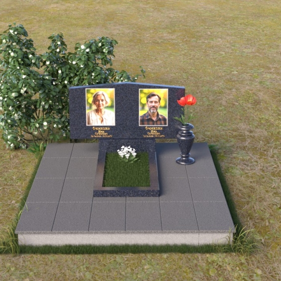 Величественная стела памятника ПГ009 выполнена в строгой, но элегантной форме. Верхняя часть представляет собой слегка асимметричную трапецию со скошенными углами, что придает ей современный и лаконичный вид. Боковые грани стелы отполированы до зеркального блеска, создавая глубокий черный цвет, который служит идеальным фоном для гравировки портретов и надписей. Нижняя часть стелы переходит в горизонтальную плиту, также тщательно отполированную, что создает единую композицию. Эта плита, в свою очередь, венчает небольшую прямоугольную тумбу, выполненную в том же стиле, обеспечивая устойчивость и завершенный вид.