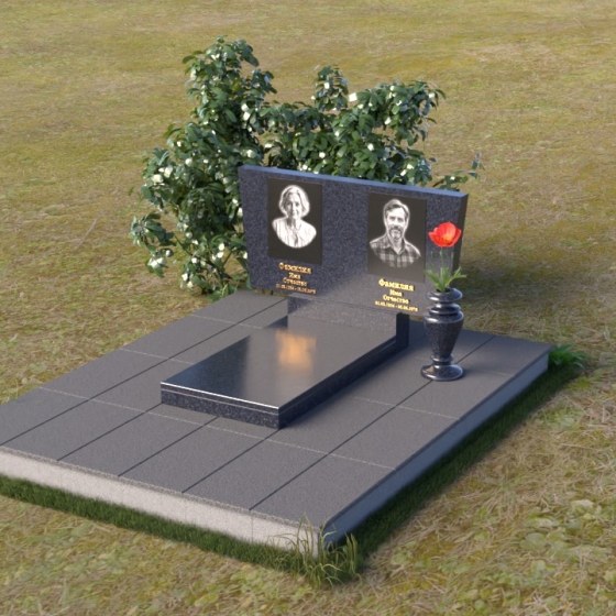 Этот памятник представляет собой изысканную композицию, где строгость линий сочетается с плавными, утонченными деталями. Стела имеет прямоугольную форму с асимметричной верхней гранью. С левой стороны верхний угол плавно скошен вниз, создавая ощущение ниспадающей драпировки или крыла ангела, оберегающего покой усопших. Правый верхний угол стелы остается прямым, что придает конструкции визуальную устойчивость и завершенность. Боковые грани стелы тщательно отполированы, что создает эффект зеркального блеска, отражающего окружающий мир и символизирующего связь между земным и небесным. Под стелой располагается горизонтальная плита меньшего размера, также выполненная в зеркальной полировке, создавая эффект единого целого и усиливая визуальную глубину композиции. Все элементы памятника установлены на широкое основание, облицованное плиткой серого цвета, что обеспечивает устойчивость и долговечность конструкции.