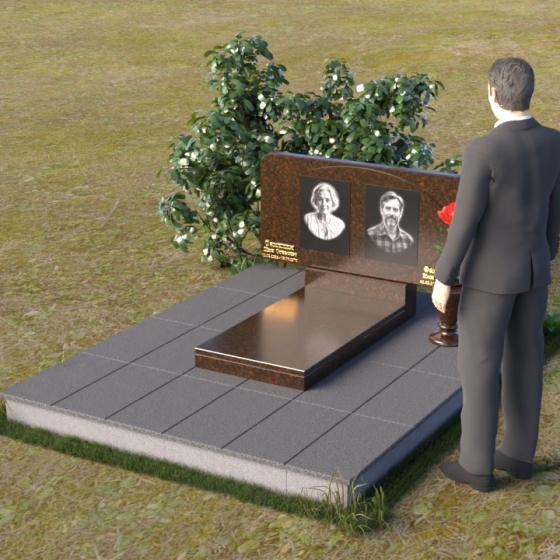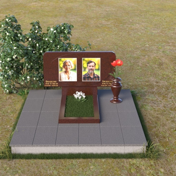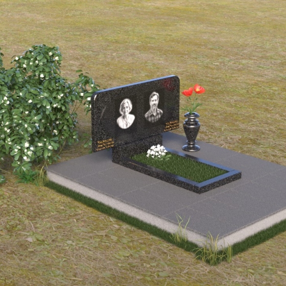 Форма стелы этого ритуального изделия идеально подходит для размещения двух портретов. Композиция с двумя изображениями, выполненными в технике гравировки, выглядит гармонично и сбалансированно. Под портретами можно расположить надпись с именем, датами жизни и короткой эпитафией. Золотое тиснение букв на черном граните создает эффект контраста и придает тексту дополнительную выразительность. Небольшая тумба, расположенная под стелой, служит подставкой для плиты с именами и годами жизни. Рядом с памятником можно установить вазу для цветов, выполненную в том же стиле и из того же материала, что и сам памятник. Это создаст единый ансамбль и подчеркнет целостность композиции. Дополнительно можно установить лампаду или небольшой фонарь, которые будут освещать памятник в темное время суток, создавая атмосферу умиротворения и светлой памяти.
