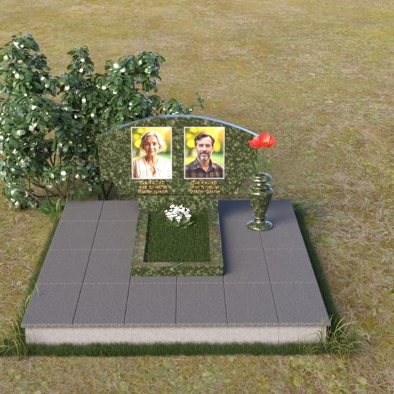 Эта мемориальная композиция, артикул ПГ023, воплощает собой сдержанную элегантность и глубокое уважение к ушедшим. Ее плавные, скруглённые линии словно рассказывают историю жизни, полной взлетов и падений, радостей и печалей, и теперь нашедшей свой покой. Верхняя часть стелы имеет мягкий, дугообразный изгиб, напоминающий о небесном своде, под которым души обретают вечный приют. Зеркальная полировка камня отражает свет, создавая ощущение легкости и воздушности, а контраст с матовой поверхностью гравировки портретов придает изображению глубину и выразительность. Простота формы не отвлекает от главного – светлых образов тех, кто дорог нашему сердцу.