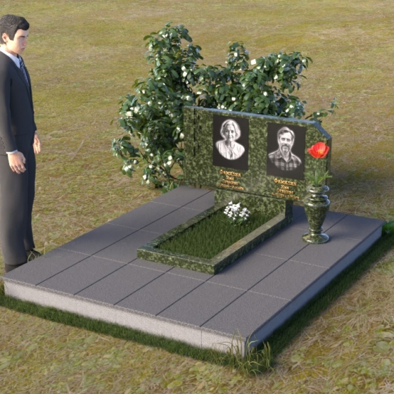 В верхней части памятника располагается вертикальная стела прямоугольной формы с небольшими скошенными углами, придающими ей более мягкий и благородный вид. На поверхности стелы размещены два портрета усопших, выполненные с высокой детализацией. В левом верхнем углу вырезано изображение православного креста, выполненного в лаконичном стиле, подчеркивающем сдержанность и глубину веры. Справа от портретов вырезана изящная роза с детально проработанными лепестками, символизирующая любовь и вечную память. Нижняя часть стелы плавно переходит в горизонтальную плиту, на которой размещается табличка с именами и датами жизни усопших. Горизонтальная плита, в свою очередь, опирается на строгий постамент, обеспечивающий устойчивость всей конструкции.