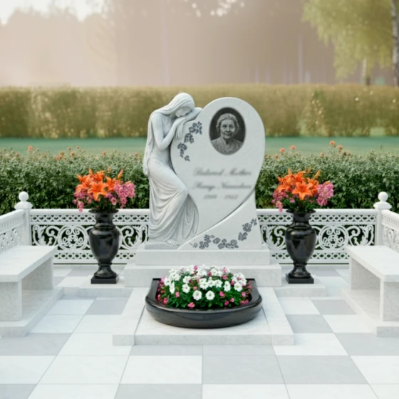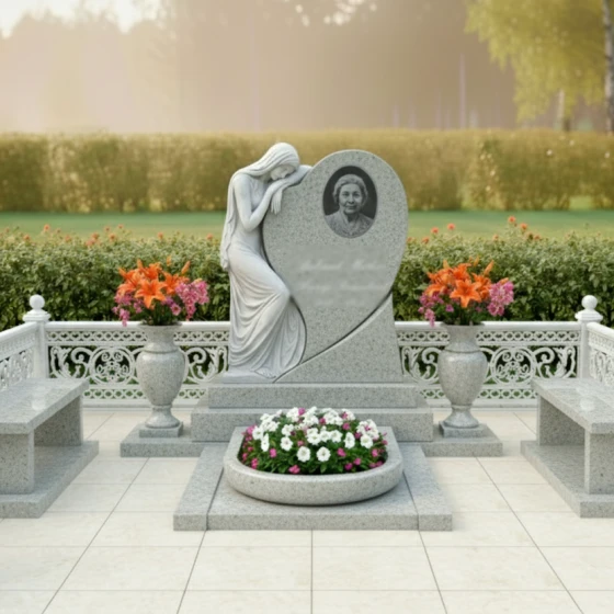 Эта мемориальная композиция, артикул ПН 103, представляет собой воплощение глубокой скорби и нежности, запечатленных в камне. В центре внимания — стела, выполненная в форме стилизованного сердца, которое плавно переходит в асимметричную волну. Этот изгиб не просто элемент дизайна, он символизирует бесконечность жизненного пути и неизбежность перехода в вечный покой, при этом сохраняя теплоту воспоминаний. Левая часть стелы увенчана изящной скульптурой скорбящей женщины. Её фигура, выполненная с невероятной детализацией, прислонилась к сердцу, выражая безмолвную печаль. Драпировка её одежд, кажется, струится по камню, создавая ощущение легкости и воздушности, несмотря на массивность материала. Контраст между зеркально отполированной поверхностью основного черного гранита и матовым, словно припорошенным инеем, срезом камня на фигуре скорбящей женщины, подчеркивает глубину эмоций и придает композиции особую выразительность. В правой части сердца, в обрамлении лаконичного овала, располагается место для портрета, словно медальон, хранящий драгоценный образ. Под портретом, на идеально гладкой поверхности, предусмотрено место для эпитафии, где каждое слово обретает особую значимость.