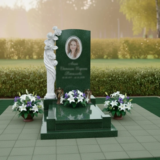 Центральный элемент композиции — строгая, но при этом изысканная стела, выполненная в форме элегантной арки с мягким, округлым верхом. Ее грани тщательно отполированы до зеркального блеска, создавая глубокий черный фон, который идеально контрастирует с нежностью и чистотой резных элементов. Слева от стелы возвышается потрясающая скульптура, изображающая пышную ветвь роз. Каждая роза, от бутона до полностью раскрывшегося цветка, вырезана с удивительной детализацией: видны тонкие лепестки, их изящные изгибы и нежная фактура. Белый цвет камня, из которого выполнена скульптура, подчеркивает ее воздушность и чистоту, создавая пронзительный контраст с темным гранитом стелы. Этот контраст между глубокой полировкой и матовой, светлой фактурой резных элементов придает монументу особую выразительность и объемность, символизируя переход от земного к вечному, от скорби к светлой памяти.