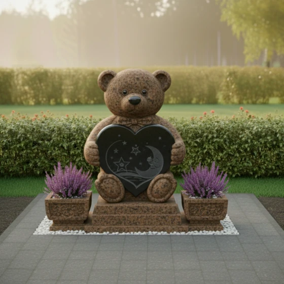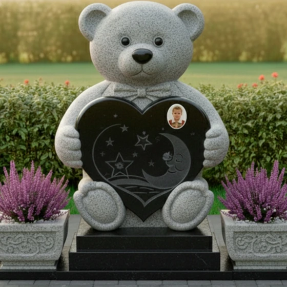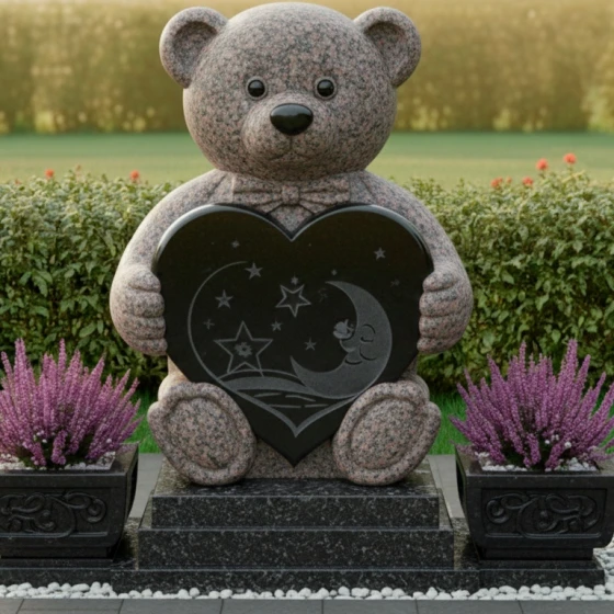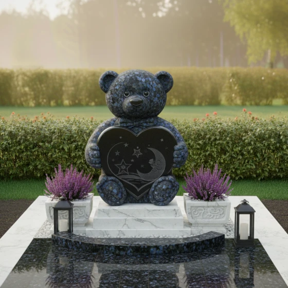 Центральным элементом композиции является изваяние в форме милого плюшевого медвежонка, выполненное из тёмного камня. Каждая деталь медвежонка проработана с удивительной тщательностью: от округлых ушек и лапок до фактурной имитации шерсти, которая придаёт фигуре мягкость и одухотворённость, несмотря на твёрдость материала. Медвежонок держит в лапках сердце — универсальный символ любви, которое становится своеобразным порталом в мир воспоминаний. На поверхности сердца выгравированы звёзды и полумесяц, создающие атмосферу тихой ночи, полной светлых грёз и нежности. Эти небесные мотивы придают композиции дополнительный символизм, напоминая о вечности души и бесконечности любви.