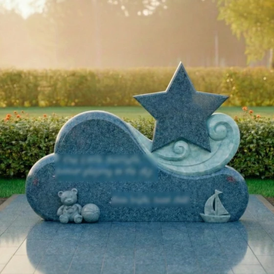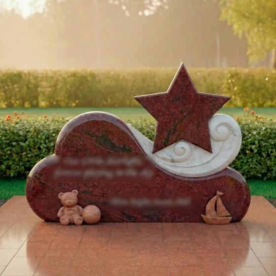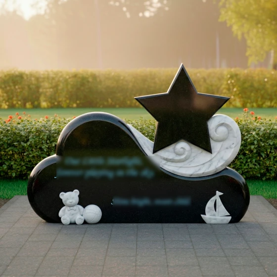 Особое внимание привлекает игра контрастов, мастерски воплощенная в этом монументе. Основная часть, выполненная из глубокого черного гранита, отполирована до зеркального сияния, в котором отражается свет и надежда. На этом фоне выделяется изящный элемент в виде стилизованной звезды, выполненный из светлого мрамора с его неповторимыми прожилками. Звезда, как символ путеводного света и вечной души, поднимается над облаком, указывая на небесный путь. Ее матовая, нежная поверхность создает гармоничный контраст с блестящим черным гранитом, подчеркивая тонкую работу мастера. Вокруг звезды, словно легкий вихрь или нежные волны, вырезаны спиралевидные элементы из того же светлого камня, добавляя композиции динамики и воздушности. В нижней части монумента, на его основании, расположены трогательные резные фигурки: милый плюшевый медвежонок с мячом и изящная лодочка. Эти элементы, выполненные из светлого камня, символизируют невинность детства, мечты и путешествие души, создавая глубоко личный и трогательный образ. Их мягкие, сглаженные формы идеально вписываются в общую концепцию плавности и нежности.