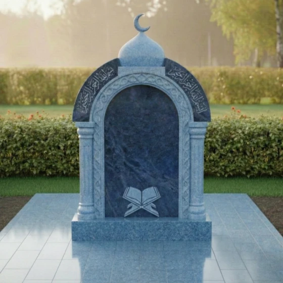 Представляем вашему вниманию величественное надгробие из натурального камня, модель ПН 507, которое является воплощением глубокого уважения и вечной памяти. Этот мемориальный комплекс спроектирован с учетом строгих архитектурных принципов, где каждая линия и форма призваны выразить достоинство и умиротворение. Центральная стела выполнена в форме изящной арки, напоминающей вход в священное пространство, что придает ей особую символичность. Ее внутренняя часть представляет собой глубокий черный полированный портал, создающий эффект зеркальной глади, в которой отражается свет и скорбь. Внешний периметр арки украшен тонкой резьбой, имитирующей витиеватые узоры, характерные для восточной архитектуры, что придает монументу уникальный и узнаваемый облик. Над аркой возвышается куполообразный элемент, увенчанный полумесяцем, что недвусмысленно указывает на его религиозную принадлежность и придает всей композиции завершенность и духовную значимость. Полумесяц выполнен с деликатной точностью, его острые грани четко очерчены на фоне неба, символизируя светлую память.